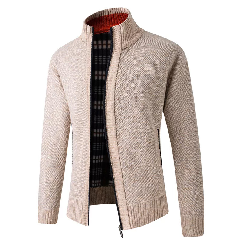 Men’s Cardigan Sweater Knitting Winter Full Zipper Long Sleeve Beige