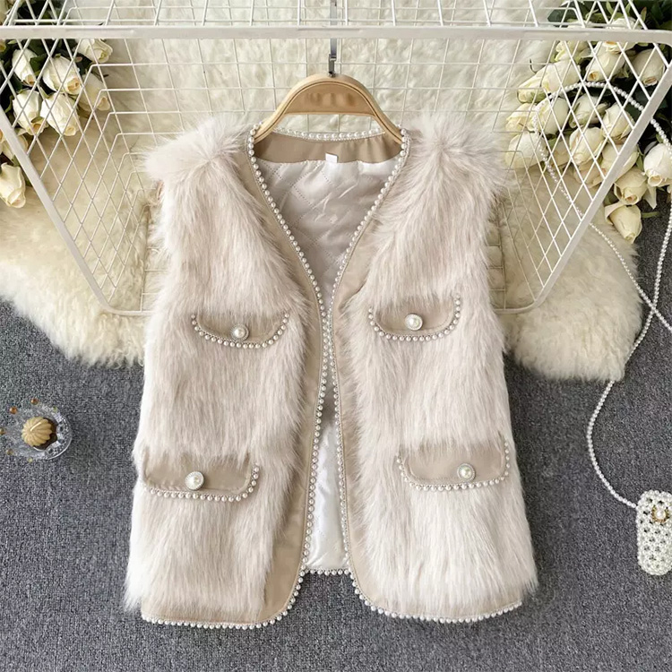 Autumn & Winter Design Pearl Faux Fur Vest Cardigan Beige