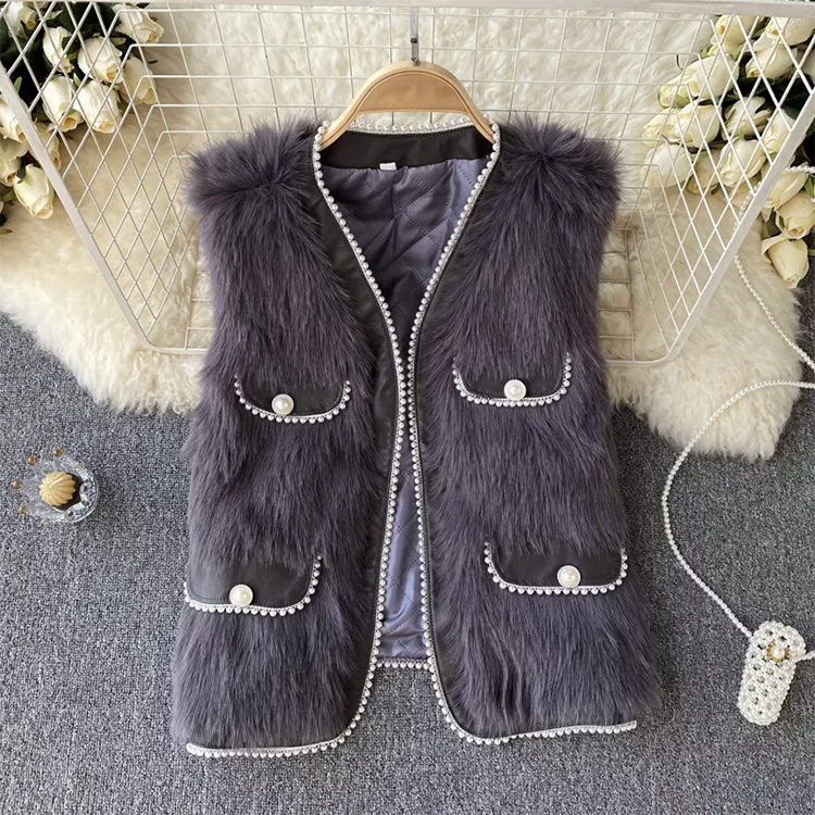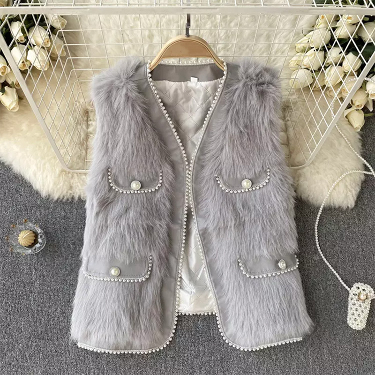 Autumn & Winter Design Pearl Faux Fur Vest Cardigan Grey
