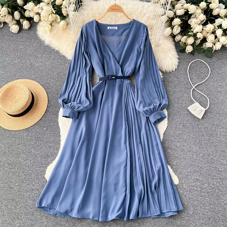 Womne’s V Neck Long Sleeve Dress With Belt Blue