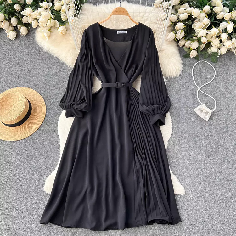 Womne’s V Neck Long Sleeve Dress With Belt Black
