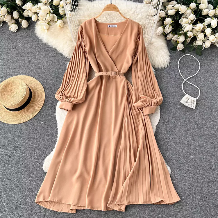 Womne’s V Neck Long Sleeve Dress With Belt Beige