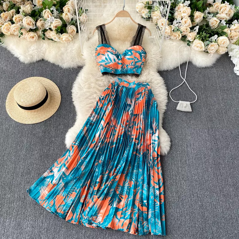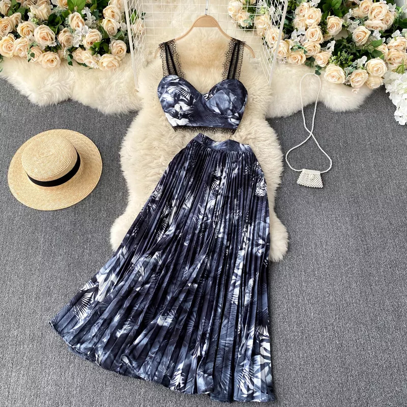 2 Piece Sets Summer Women Lace Crop Tops High Elastic Waist Blue