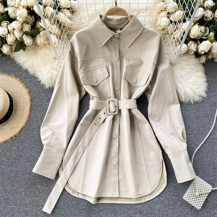 Autumn & Winter Medium Long Loose Coat Leather Beige