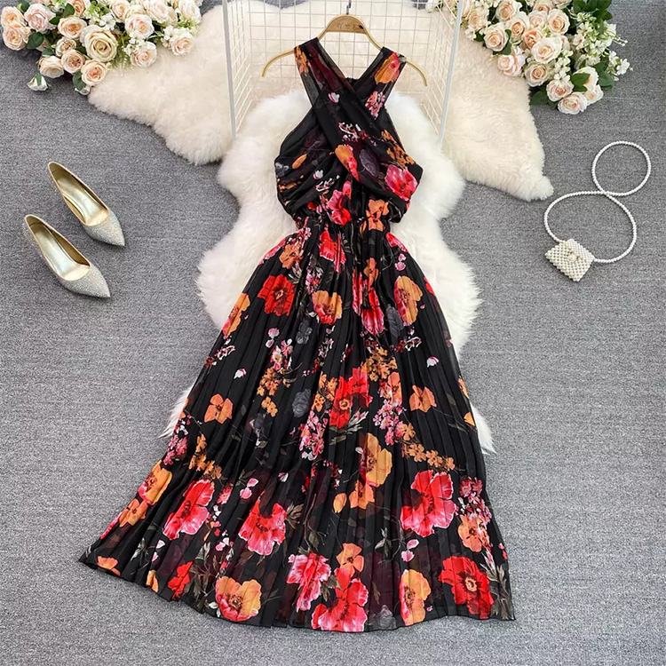 Beach Crushed Chiffon Waist Skimming Floral Dress Black