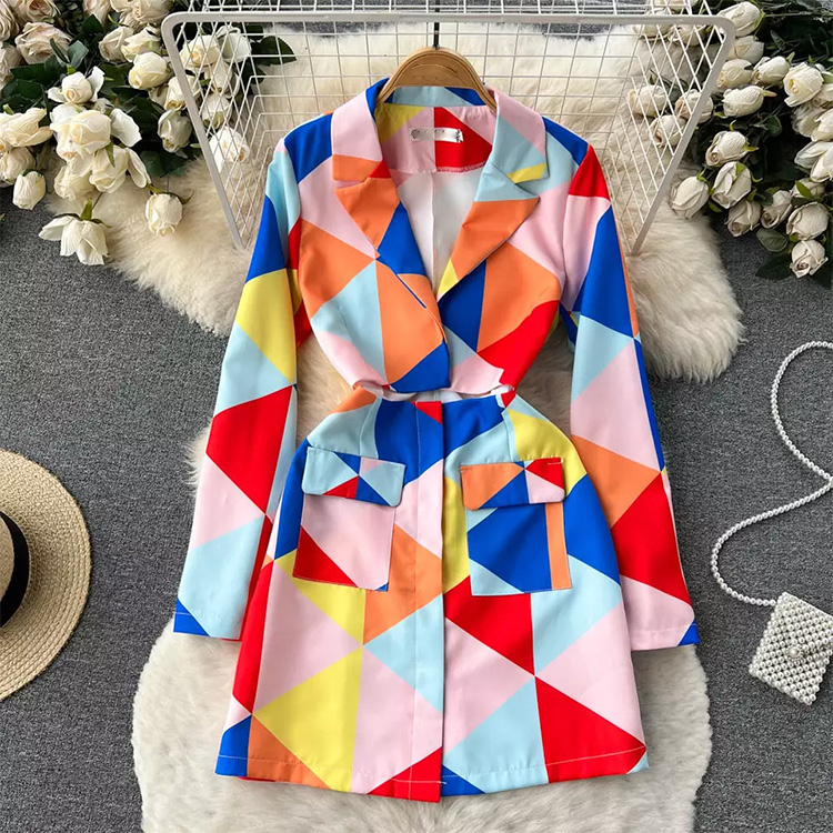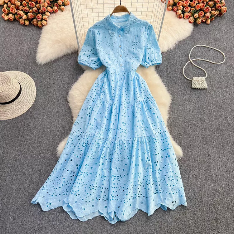 Women’s French Vintage Floral High Waist Dress Light Blue