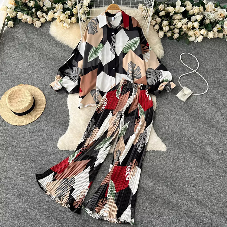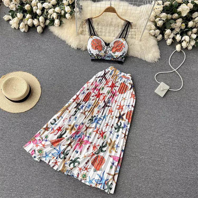 Women’s Set Printed Pleated Lace Stitching Skirt White