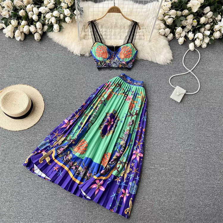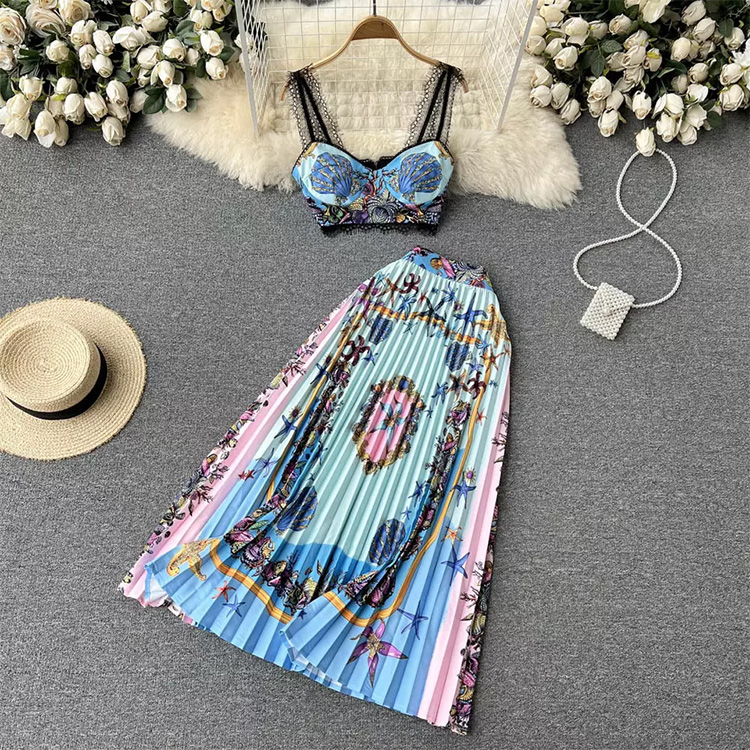 Women’s Set Printed Pleated Lace Stitching Skirt Blue Green