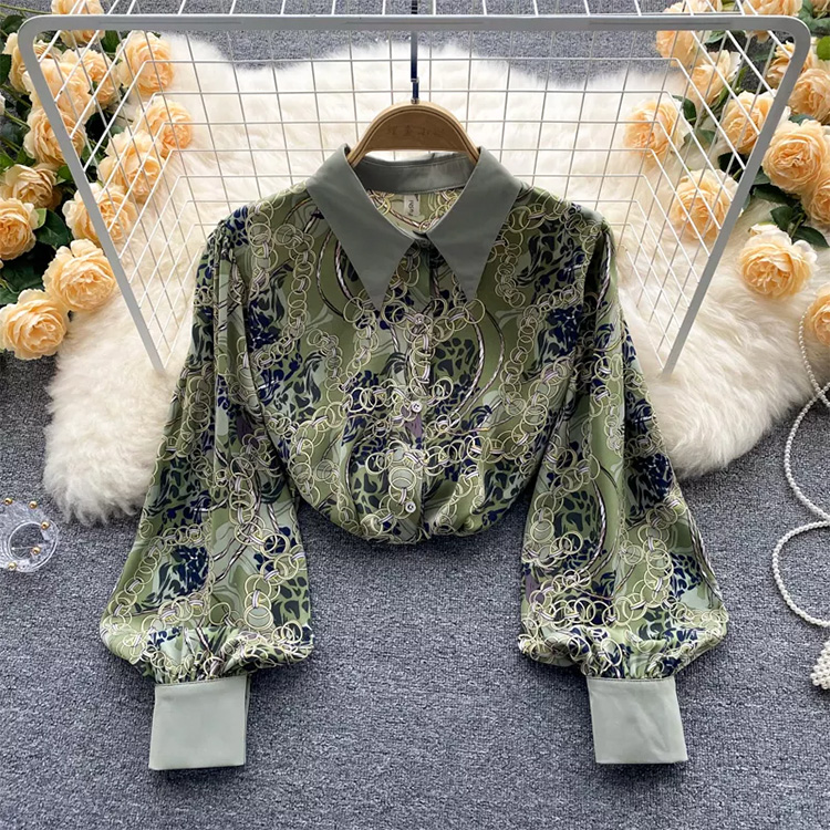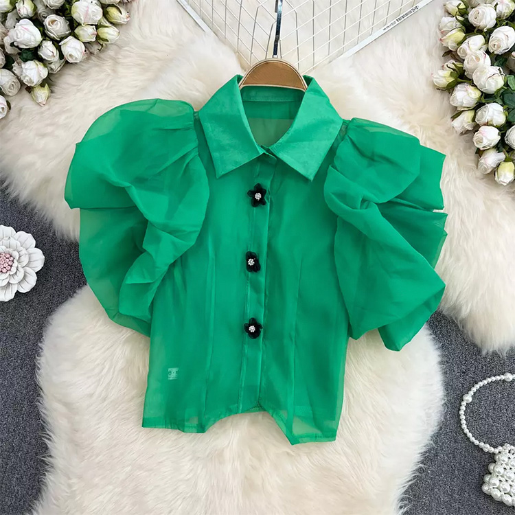 Women’s Summer Floral Lapel Bubble Sleeve Blouse Green